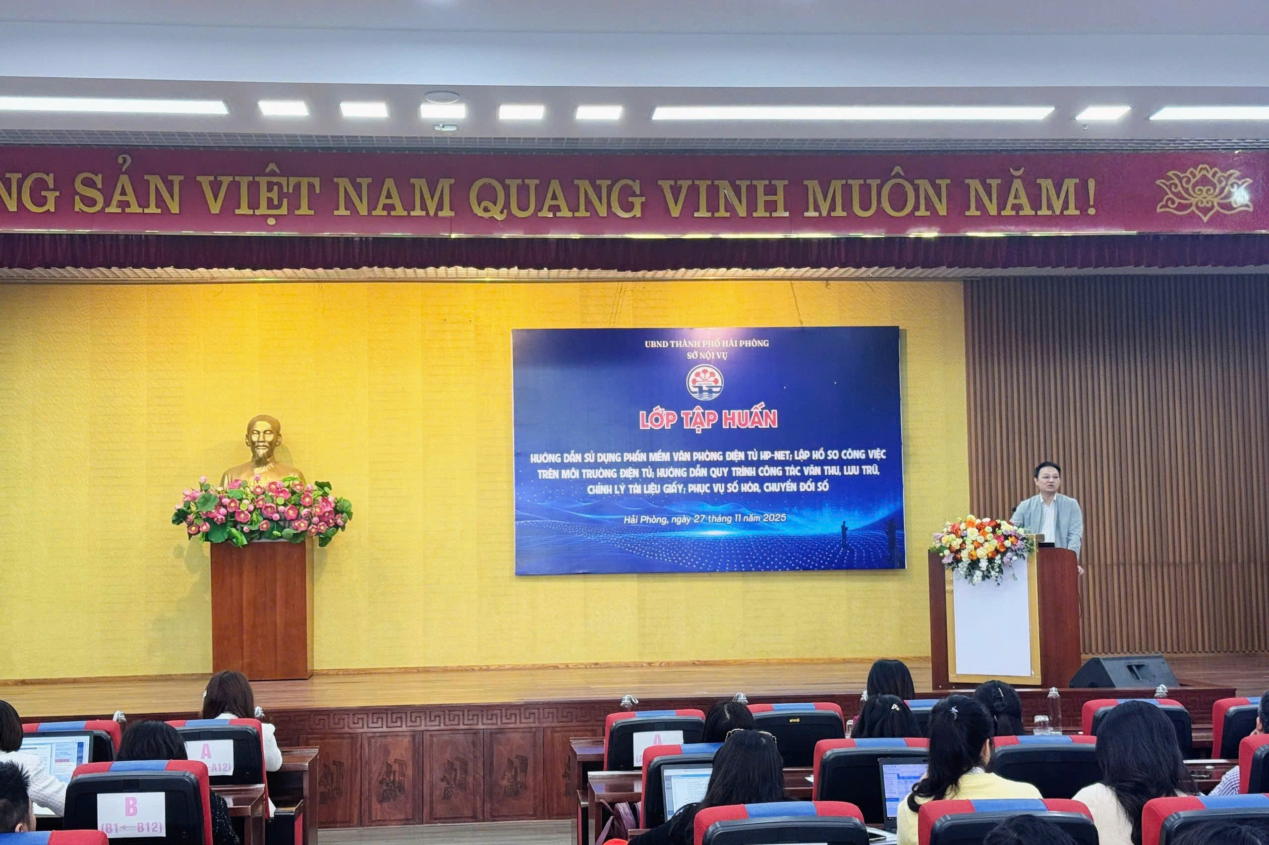Sáng 27/11/2025, Sở Nội vụ tổ chức lớp tập huấn sử dụng hệ thống phần mềm HP-net dành cho cán bộ, công chức ở các xã, phường, đặc khu trên toàn thành phố. Lớp học kết hợp hình thức trực tiếp và trực tuyến, với hơn 110 đơn vị tham gia – gồm 64 xã, phường phía Tây đến học trực tiếp tại Trung tâm Văn hóa Xứ Đông và 50 xã, phường phía Đông tham gia qua hình thức trực tuyến. Hải Phòng